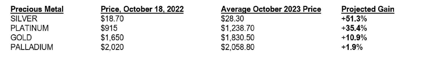 forecast platinum rising 35% to nearly $1,240 while the formerly hot palladium would rise just 2%, to $2,059. The poll was taken Tuesday, October 18, so here are the prices then, plus their 1-year average projection: